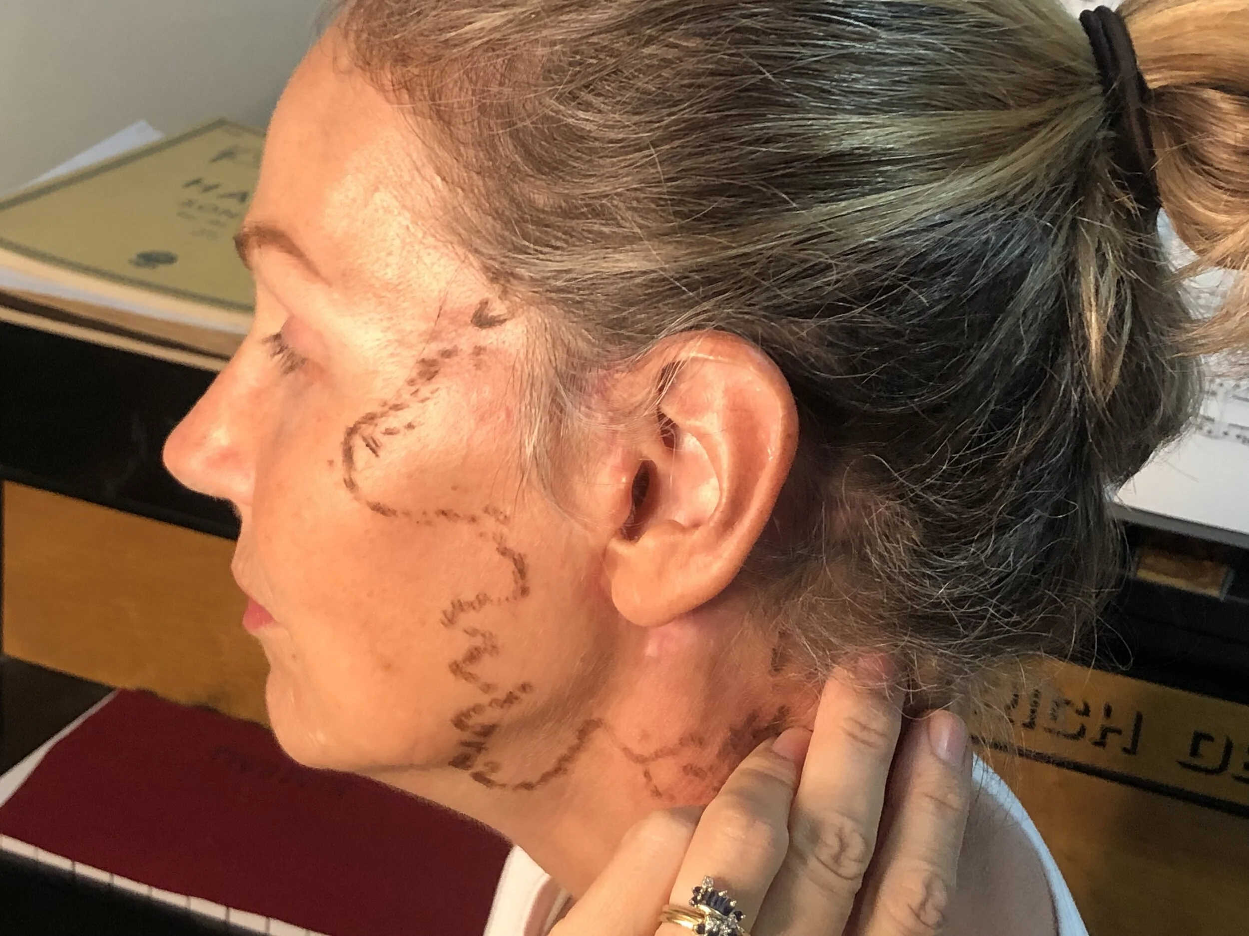 They say a picture paints a thousand words, so I’m including two images to help describe the areas that are still “re-growing” nerves that were severed during the four-hour procedure.