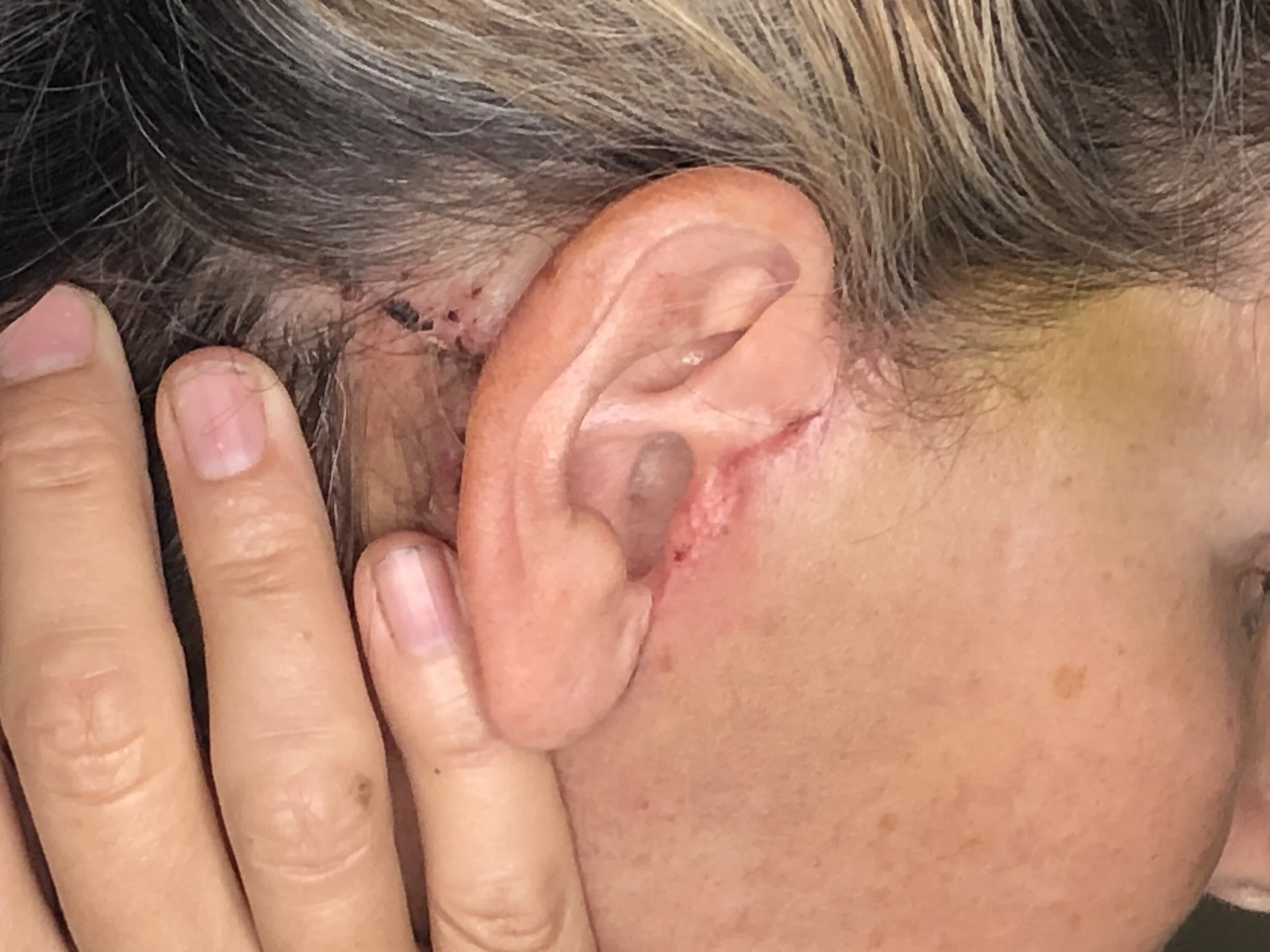 Unusual side effects can happen. For the first two weeks I couldn’t hear well out of my left ear, but was so sick and weak it was the least of my worries. I mentioned this concern when I saw my regular doctor for my annual physical on the second week following the surgery. She noted some dried blood in the ear canal of both ears, but more pronounced on the left. She gave me some advice about how to flush the ears at home. I told her I was nervous about working on my own ears since I still had no sensation in the left side. She then offered to do it for me in her office once the back of my ears (stitches areas) were less tender. After some nervousness, I rinsed my ears at home following her instructions, and her method worked after the third or fourth delicate try. I was grateful for her medical advice, and it especially felt good to know that I wasn’t losing my hearing!